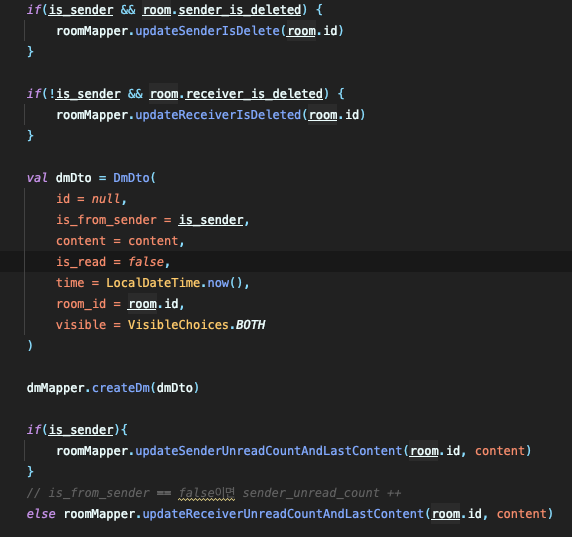 -> 이건 sender_is_deleted를 다시 0으로 update하면 해결된다. - 해당 채팅방에서 sender의 쪽지 내용은 채팅방을 삭제한 이후 다시 쪽지를 보낸 시점부터의 쪽지들이 보여야 한다.